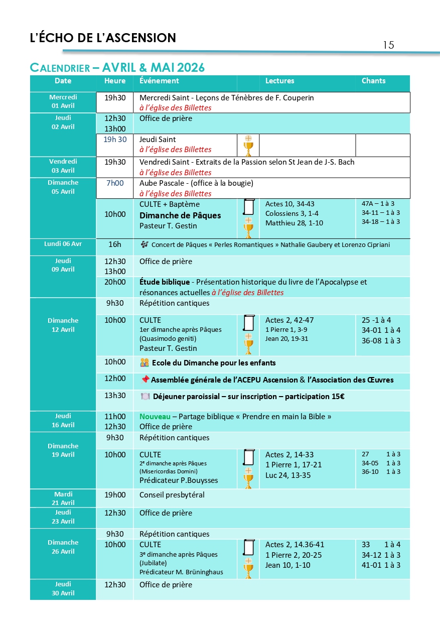 - Le 05/04/26 : Aube Pascale à 7h00 à l’église des Billettes – (Office à la bougie) puis Culte de Pâques à 10h à l’église de l’Ascension